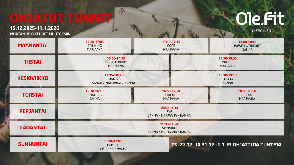 Ole.Fit Inkeroisen ohjatut tunnit tarjoaa sinulle uutta energiaa ja elinvoimaa päivääsi! Tule nauttimaan monipuolisista ja innostavista tunneistamme, jotka on suunniteltu kohottamaan hyvinvointiasi monipuolisesti.